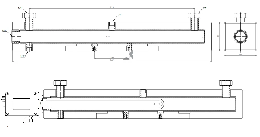 Das Heizmodul besteht aus einem massiven 60 × 60 mm Vierkantrohr mit zwei seitlich aufgeschweißten DN25-Stutzen. Der integrierte Heizstab wandelt Strom direkt in Wärme um – ganz ohne Speichertank. Dank der kompakten Maße (550 mm bzw. 860 mm Länge) lässt sich das Modul nahezu überall montieren – auch bei begrenzten Platzverhältnissen.