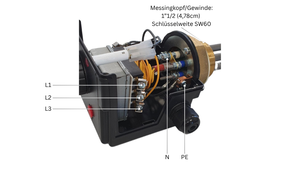Das Elektroheizelement besteht aus hochwertigem Incoloy 825. Es ist mit einem G6/4 Messingkopf verbunden. - Klemmenleiste:
