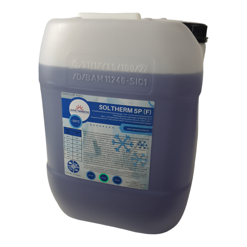 Auf der Basis von Glykol (Propylenglykol) setzt SOLtherm 5 (Konzentrat -58°C) und SOLtherm F (einfüllfertig -32°C) den Gefrierpunkt von Wasser deutlich herab und verhindert so das Gefrieren der Betriebsflüssigkeiten in Solaranlagen. SOLtherm 5 (Konzentrat -58°C) und SOLtherm F (einfüllfertig -32°C) gewährleistet, dass Solarsysteme auch bei Minustemperaturen sicher betrieben werden können. Eine frostbedingte Beschädigung des Systems durch eine Sprengwirkung wird durch die Solarflüssigkeit SOLtherm 5 (Konzentrat -58°C) und SOLtherm F (einfüllfertig -32°C) sicher vermieden.