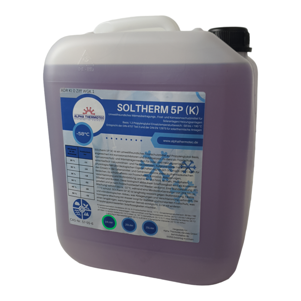 Auf der Basis von Glykol (Propylenglykol) setzt SOLtherm 5 (Konzentrat -58°C) und SOLtherm F (einfüllfertig -32°C) den Gefrierpunkt von Wasser deutlich herab und verhindert so das Gefrieren der Betriebsflüssigkeiten in Solaranlagen. SOLtherm 5 (Konzentrat -58°C) und SOLtherm F (einfüllfertig -32°C) gewährleistet, dass Solarsysteme auch bei Minustemperaturen sicher betrieben werden können. Eine frostbedingte Beschädigung des Systems durch eine Sprengwirkung wird durch die Solarflüssigkeit SOLtherm 5 (Konzentrat -58°C) und SOLtherm F (einfüllfertig -32°C) sicher vermieden.