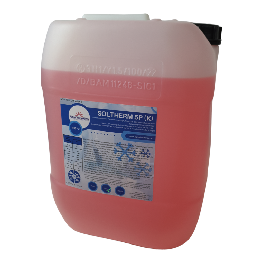 Auf der Basis von Glykol (Propylenglykol) setzt SOLtherm 5 (Konzentrat -58°C) und SOLtherm F (einfüllfertig -32°C) den Gefrierpunkt von Wasser deutlich herab und verhindert so das Gefrieren der Betriebsflüssigkeiten in Solaranlagen. SOLtherm 5 (Konzentrat -58°C) und SOLtherm F (einfüllfertig -32°C) gewährleistet, dass Solarsysteme auch bei Minustemperaturen sicher betrieben werden können. Eine frostbedingte Beschädigung des Systems durch eine Sprengwirkung wird durch die Solarflüssigkeit SOLtherm 5 (Konzentrat -58°C) und SOLtherm F (einfüllfertig -32°C) sicher vermieden.