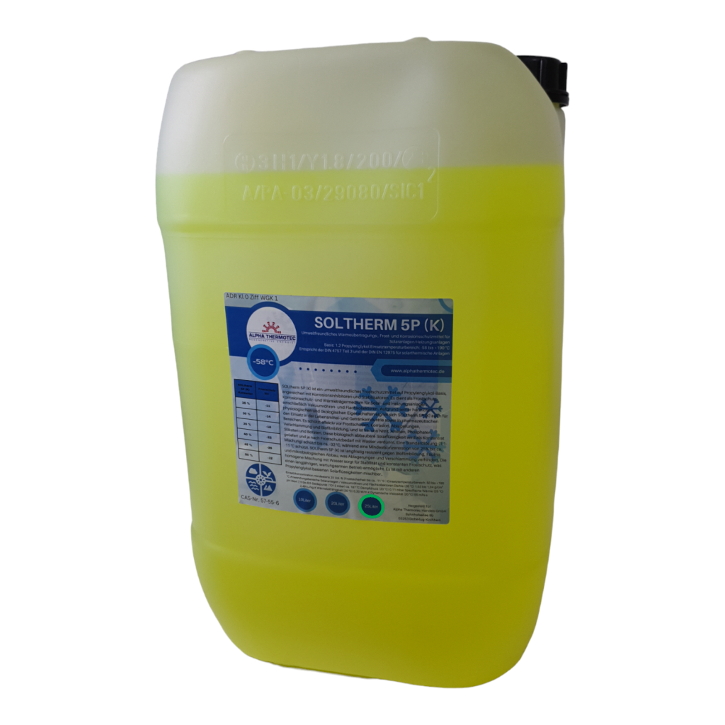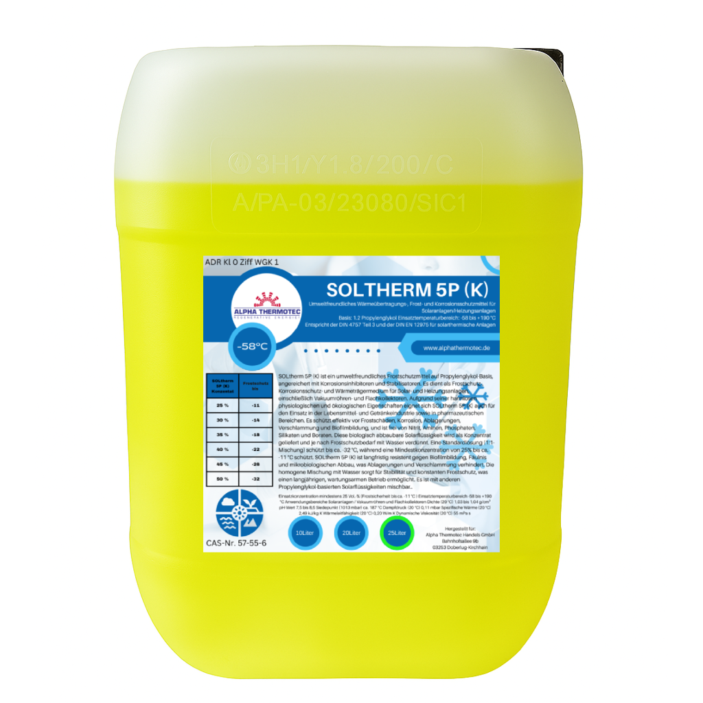 Auf der Basis von Glykol (Propylenglykol) setzt SOLtherm 5 (Konzentrat -58°C) und SOLtherm F (einfüllfertig -32°C) den Gefrierpunkt von Wasser deutlich herab und verhindert so das Gefrieren der Betriebsflüssigkeiten in Solaranlagen. SOLtherm 5 (Konzentrat -58°C) und SOLtherm F (einfüllfertig -32°C) gewährleistet, dass Solarsysteme auch bei Minustemperaturen sicher betrieben werden können. Eine frostbedingte Beschädigung des Systems durch eine Sprengwirkung wird durch die Solarflüssigkeit SOLtherm 5 (Konzentrat -58°C) und SOLtherm F (einfüllfertig -32°C) sicher vermieden.