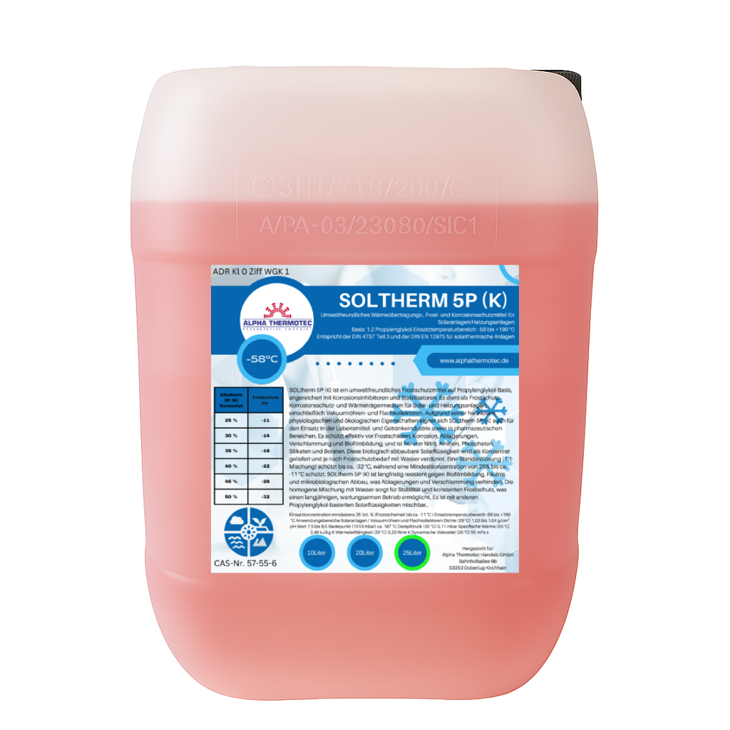 Auf der Basis von Glykol (Propylenglykol) setzt SOLtherm 5 (Konzentrat -58°C) und SOLtherm F (einfüllfertig -32°C) den Gefrierpunkt von Wasser deutlich herab und verhindert so das Gefrieren der Betriebsflüssigkeiten in Solaranlagen. SOLtherm 5 (Konzentrat -58°C) und SOLtherm F (einfüllfertig -32°C) gewährleistet, dass Solarsysteme auch bei Minustemperaturen sicher betrieben werden können. Eine frostbedingte Beschädigung des Systems durch eine Sprengwirkung wird durch die Solarflüssigkeit SOLtherm 5 (Konzentrat -58°C) und SOLtherm F (einfüllfertig -32°C) sicher vermieden.