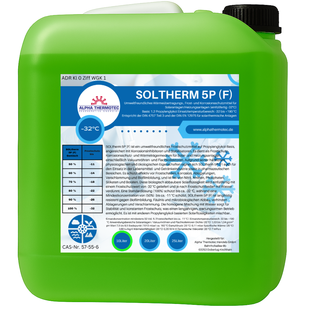 Auf der Basis von Glykol (Propylenglykol) setzt SOLtherm 5 (Konzentrat -58°C) und SOLtherm F (einfüllfertig -32°C) den Gefrierpunkt von Wasser deutlich herab und verhindert so das Gefrieren der Betriebsflüssigkeiten in Solaranlagen. SOLtherm 5 (Konzentrat -58°C) und SOLtherm F (einfüllfertig -32°C) gewährleistet, dass Solarsysteme auch bei Minustemperaturen sicher betrieben werden können. Eine frostbedingte Beschädigung des Systems durch eine Sprengwirkung wird durch die Solarflüssigkeit SOLtherm 5 (Konzentrat -58°C) und SOLtherm F (einfüllfertig -32°C) sicher vermieden.