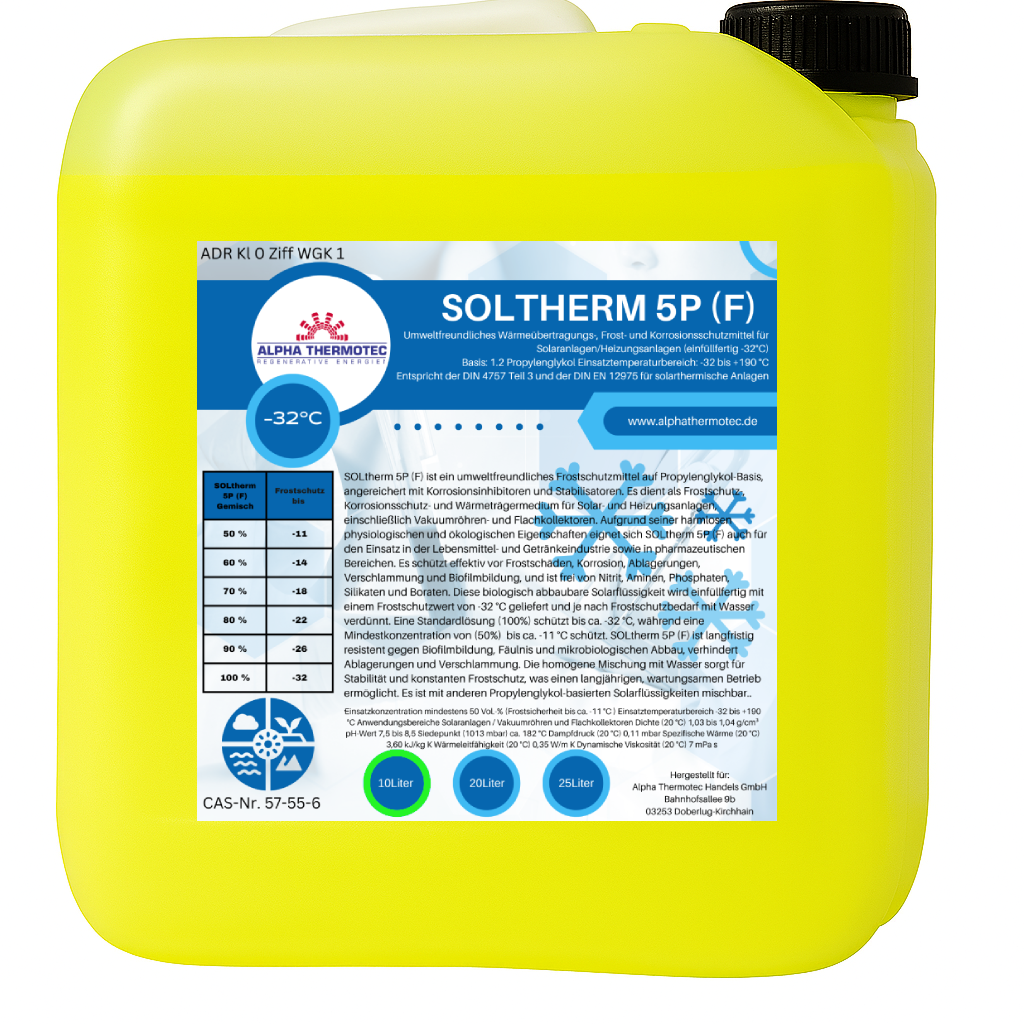 Auf der Basis von Glykol (Propylenglykol) setzt SOLtherm 5 (Konzentrat -58°C) und SOLtherm F (einfüllfertig -32°C) den Gefrierpunkt von Wasser deutlich herab und verhindert so das Gefrieren der Betriebsflüssigkeiten in Solaranlagen. SOLtherm 5 (Konzentrat -58°C) und SOLtherm F (einfüllfertig -32°C) gewährleistet, dass Solarsysteme auch bei Minustemperaturen sicher betrieben werden können. Eine frostbedingte Beschädigung des Systems durch eine Sprengwirkung wird durch die Solarflüssigkeit SOLtherm 5 (Konzentrat -58°C) und SOLtherm F (einfüllfertig -32°C) sicher vermieden.